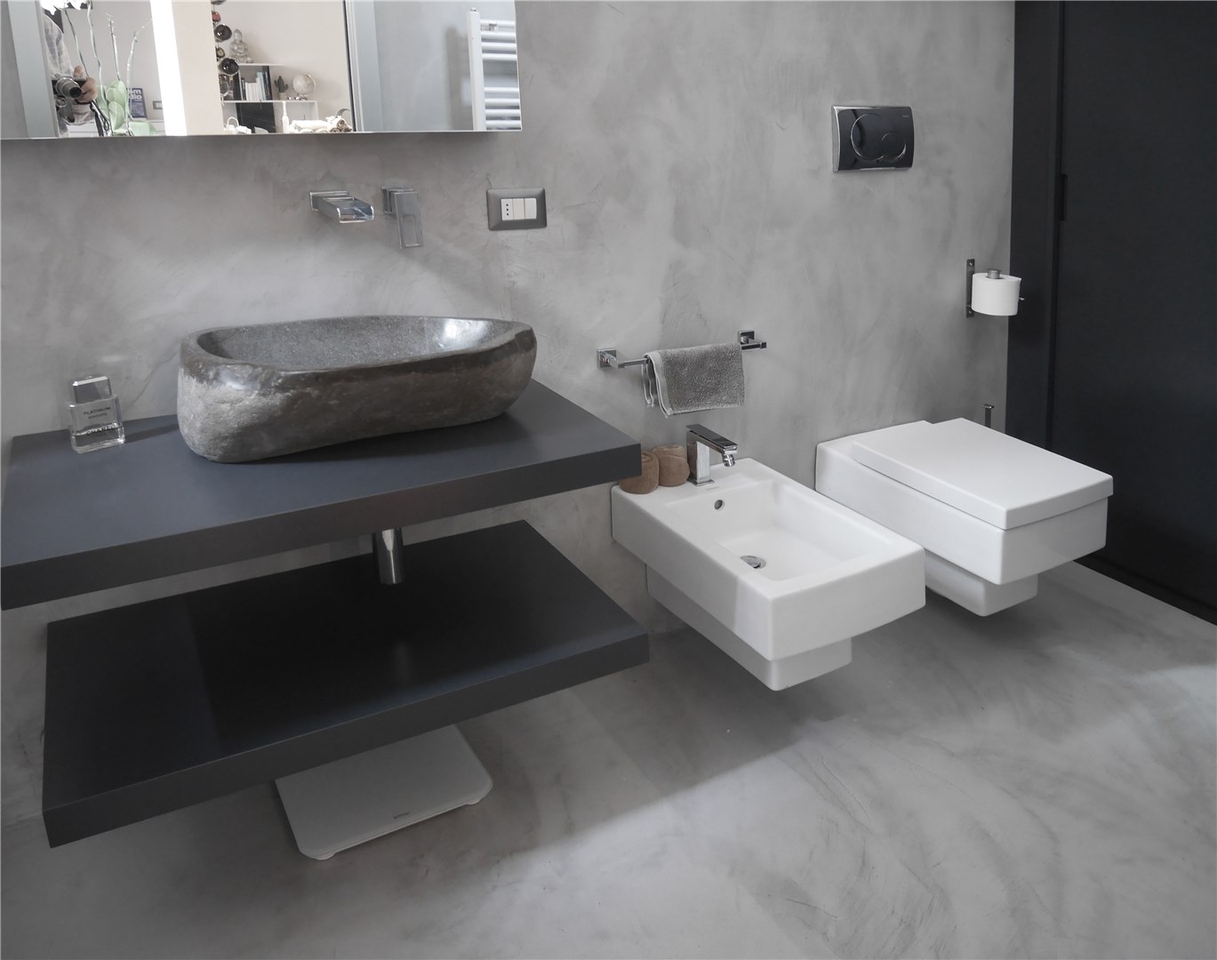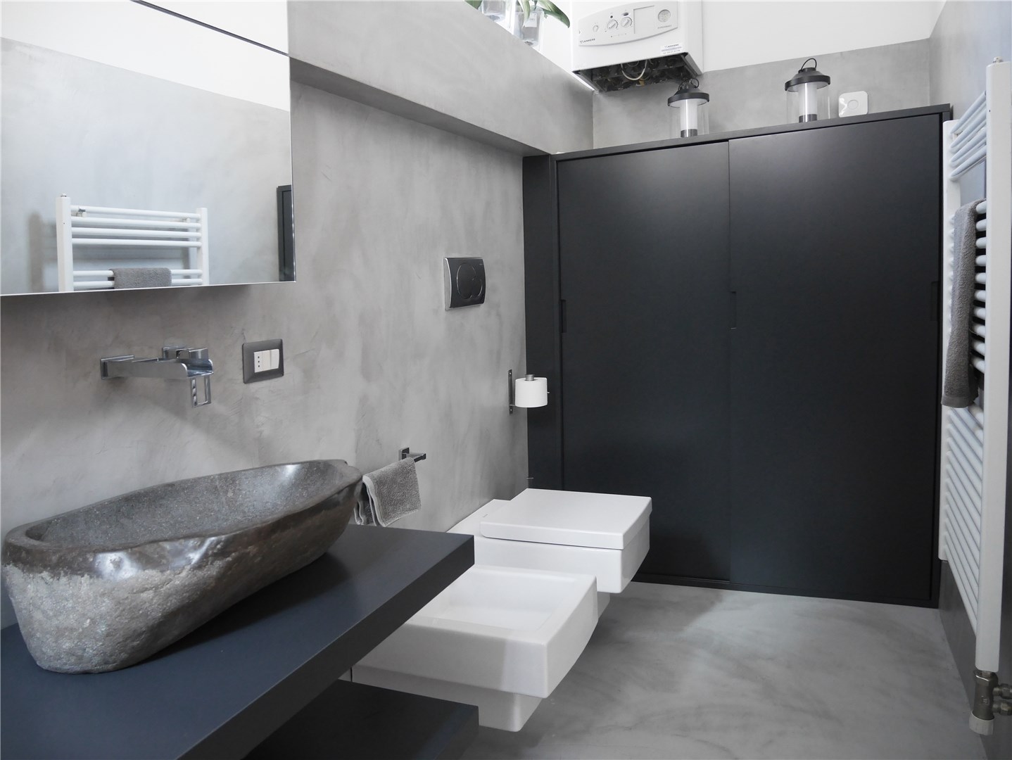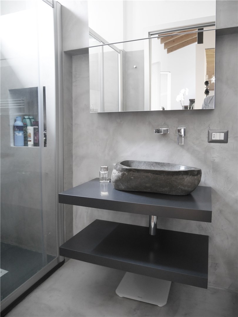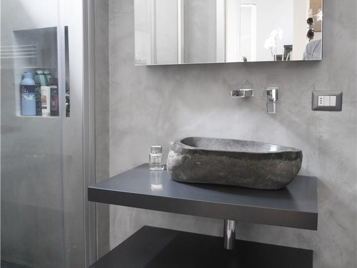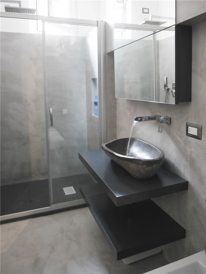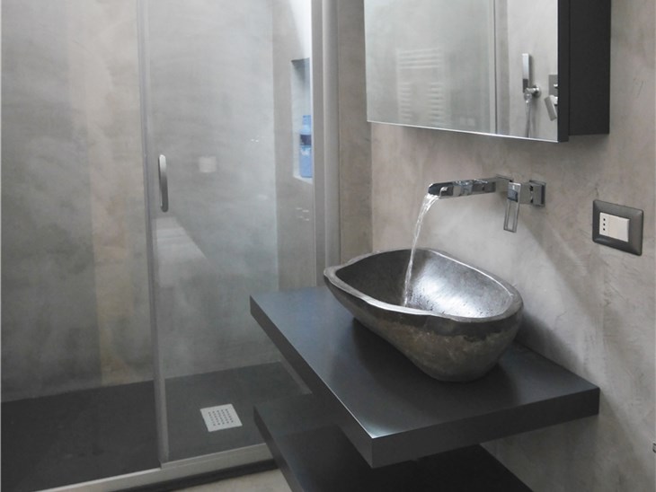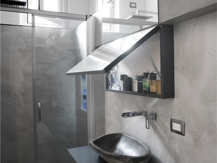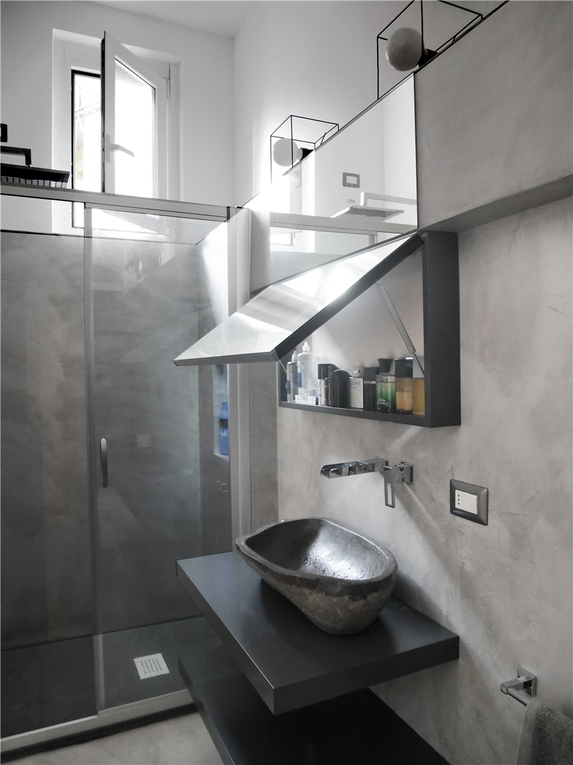 L’intervento ha quindi previsto il rifacimento delle finiture (pavimento e pareti sono stati integralmente rifatti e rivestiti in microcemento grigio di media intensità). I sanitari sono stati lasciati nella stessa posizione (mantenendo anche gli stessi elementi). È invece stata interamente rifatta la zona lavabo: sono state realizzate due mensole su disegno laccate di grigio antracite con posizionamento di una bacinella da appoggio in pietra e erogazione a parete con effetto cascata. Sopra il lavandino è stato disegnato su misura uno specchio contenitore sagomato per risolvere l’interferenza con la trave strutturale preesistente.