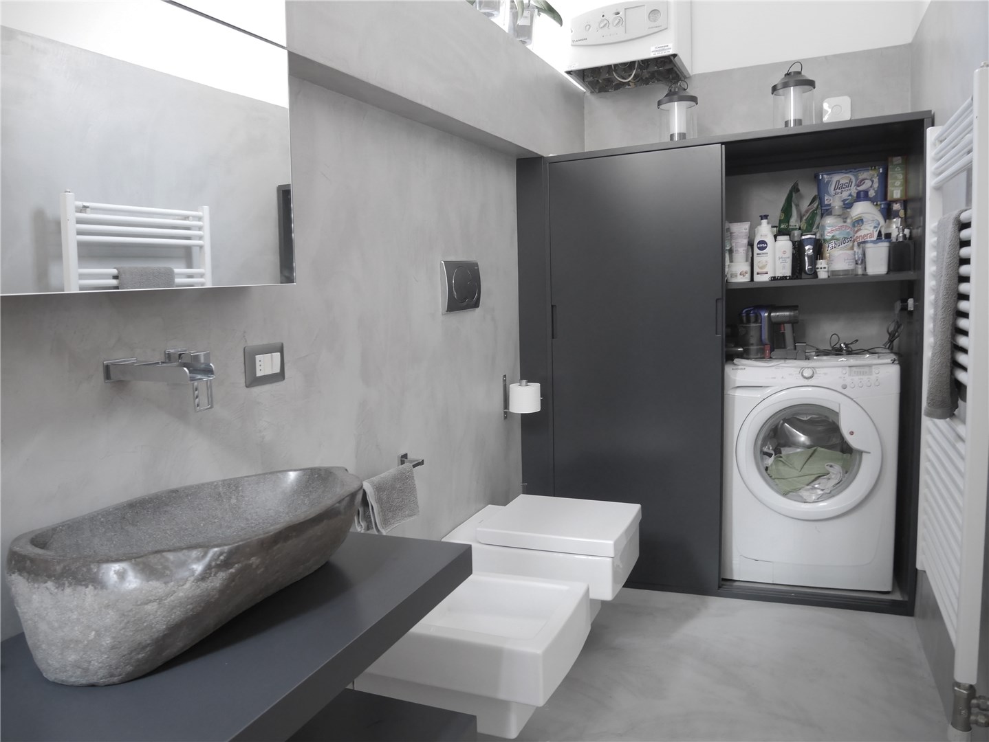 La zona lavanderia è stata risolta tramite la realizzazione di un’armadiatura disegnata su misura con ante scorrevoli che nascondono la lavatrice e il materiale per la pulizia, con la stessa finitura laccata colore antracite delle mensole del lavandino. Completa il bagno a doccia con piatto antracite della stessa tonalità dell’arredo su misura.